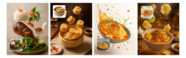 ✅ Tambahan elemen visual sesuai jenis produk: uap, cabai, remah, es batu, dll